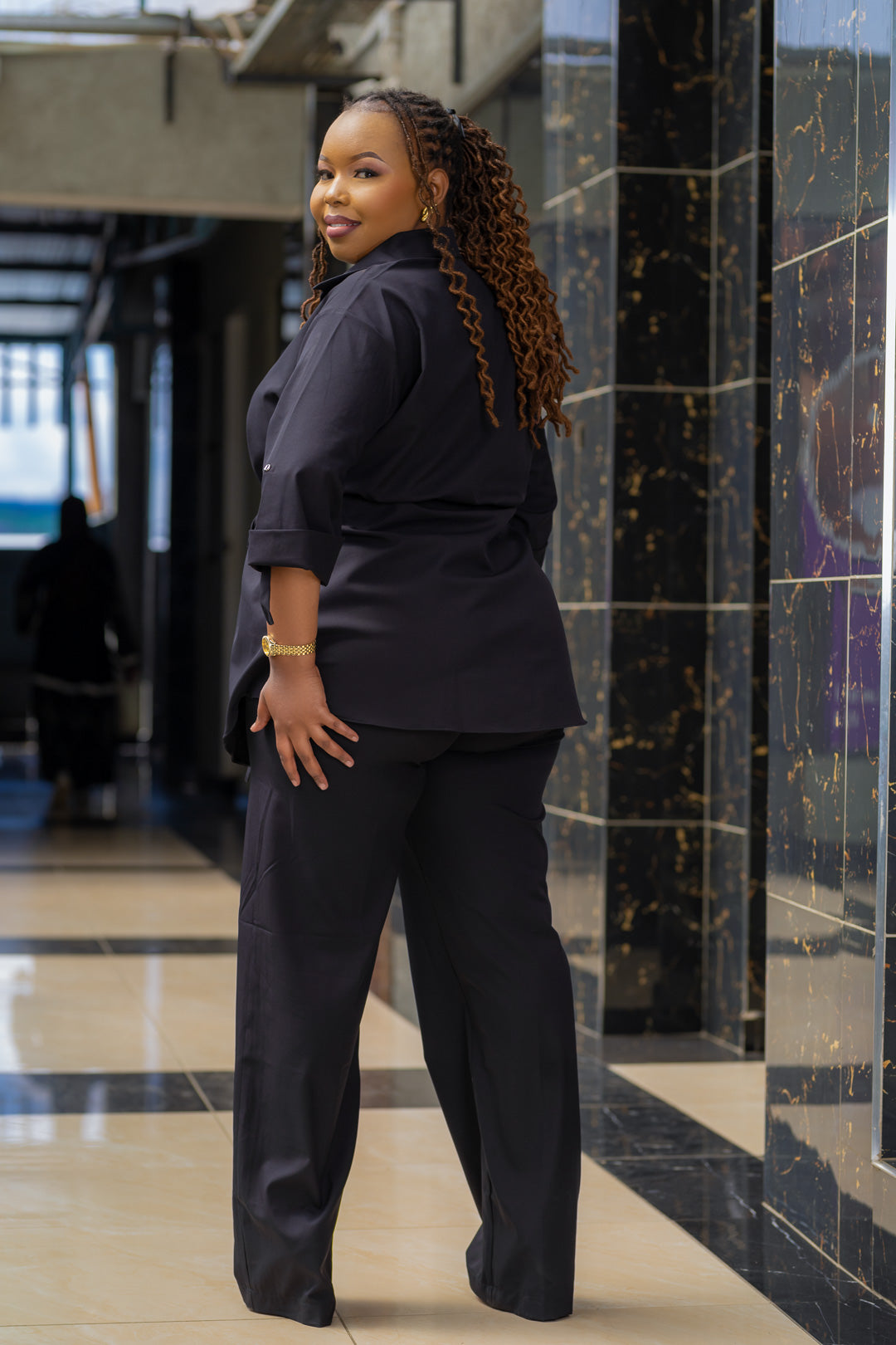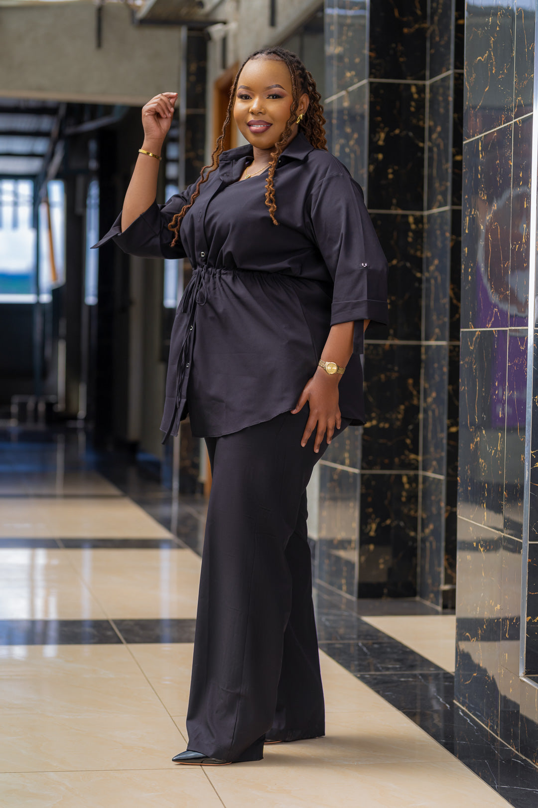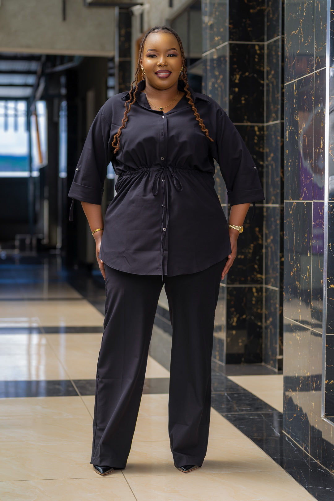 Unleash your fashion sense with DOUBLE TAKE 2PC SET! This set includes a 3/4 sleeve shirt with a pilot effect, and matching pants with a drawstring waist for ultimate comfort. Made with a soft and durable Dacron cotton blend, this set also features a collared neckline and wide leg pants for a chic and versatile look. Elevate your wardrobe today!