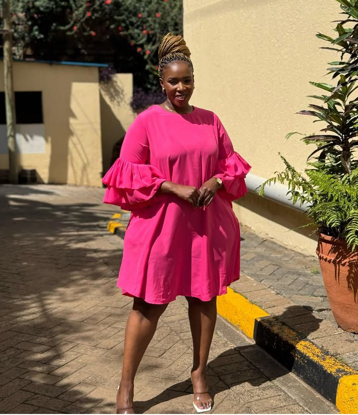 This knee-length dress features elbow-level sleeves with ruffles at the elbows, a round neck, and pigmented pieces. Perfect for everyday wear, this dress adds a touch of elegance and style to any outfit. A must-have addition to any wardrobe.