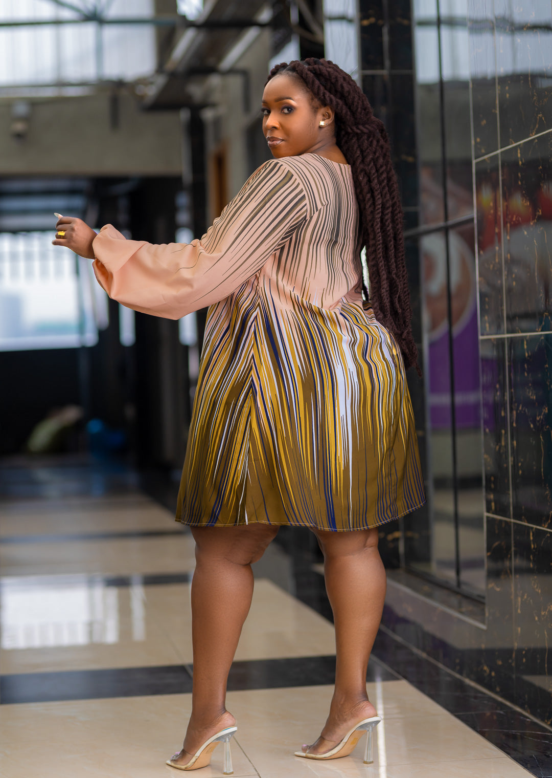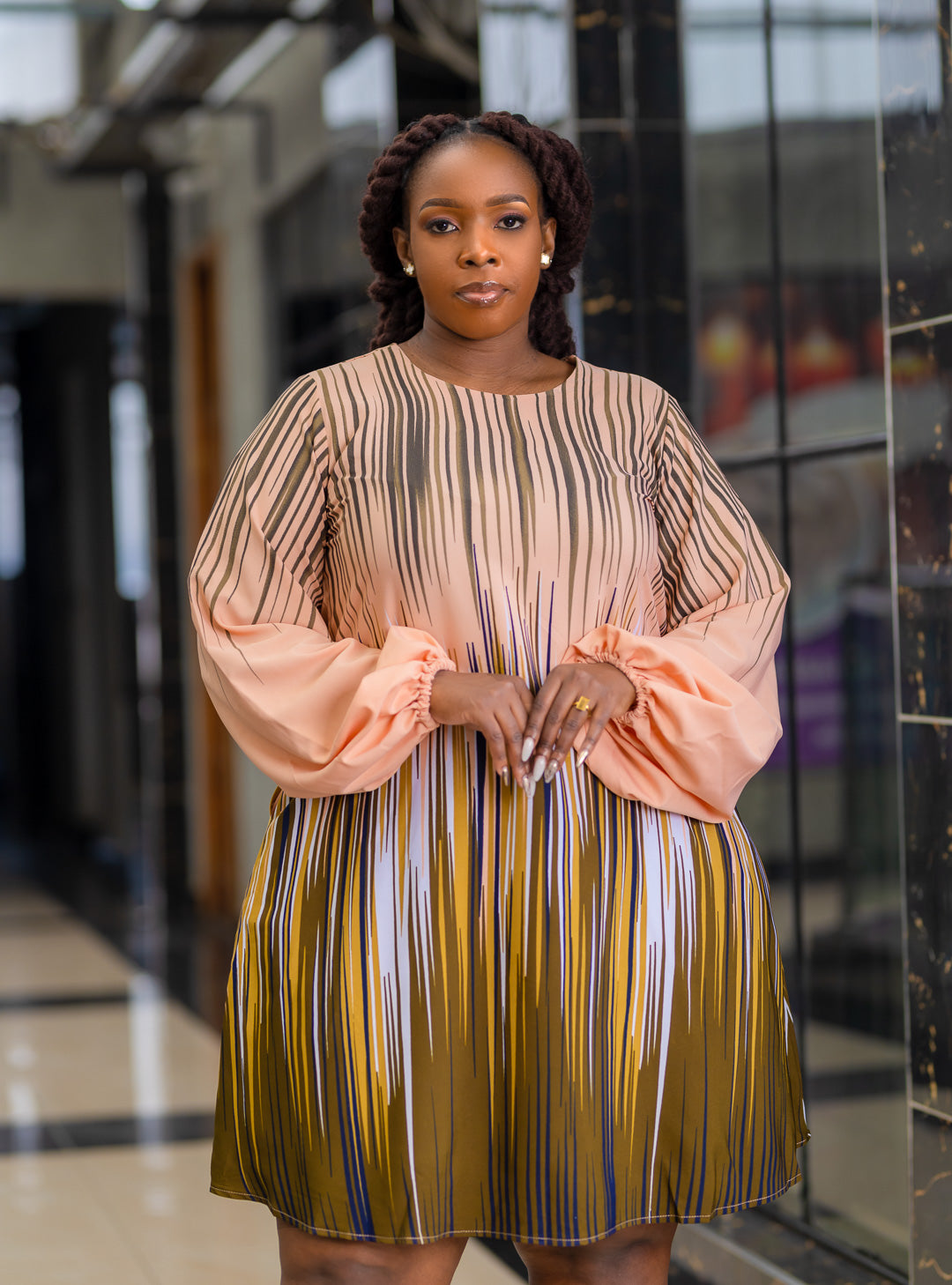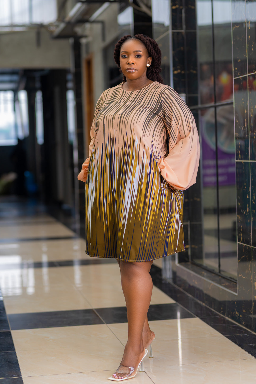 The Galaxy Shift Dress combines effortless elegance with bold artistic flair. This midi masterpiece features a relaxed, flowing silhouette that moves beautifully with you, paired with statement balloon sleeves that gather at elasticated cuffs for a touch of contemporary sophistication. The vibrant abstract vertical line pattern—blending peach, olive green, black, with subtle hints of blue and white—creates a striking visual that transitions seamlessly from day to evening. The comfortable, loose drape ensures all-day wearability while the midi length offers versatile styling options. Perfect for those who refuse to compromise between comfort and standout style, this dress is your go-to piece for making an impression.
