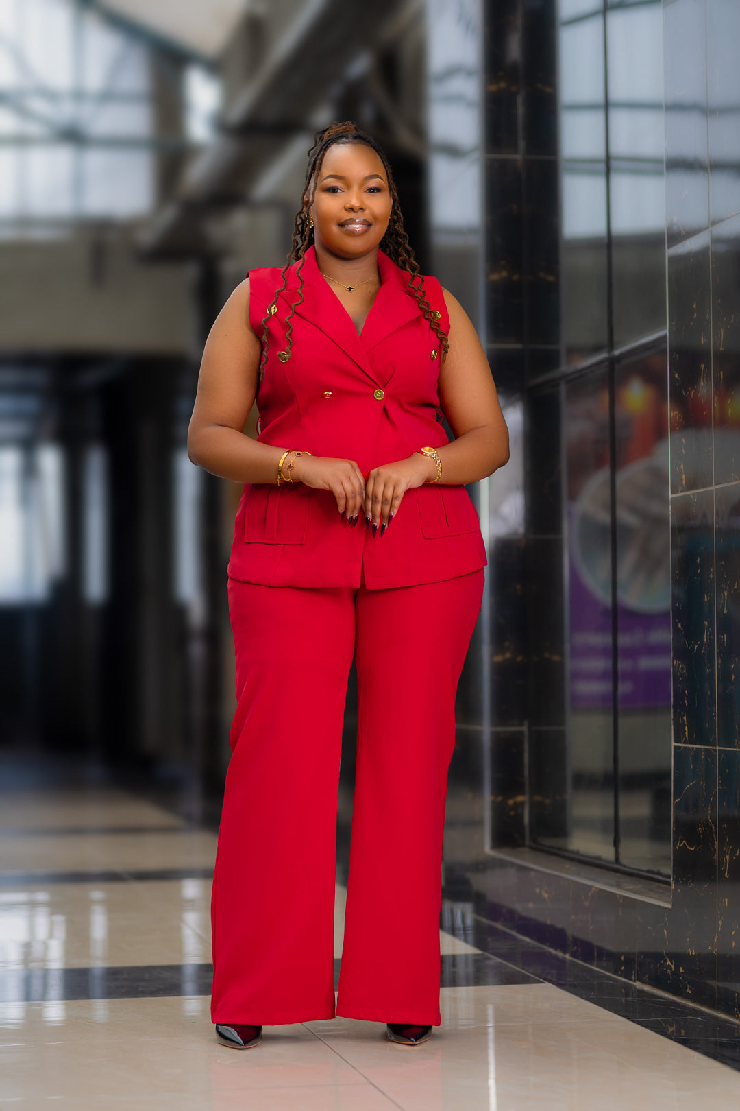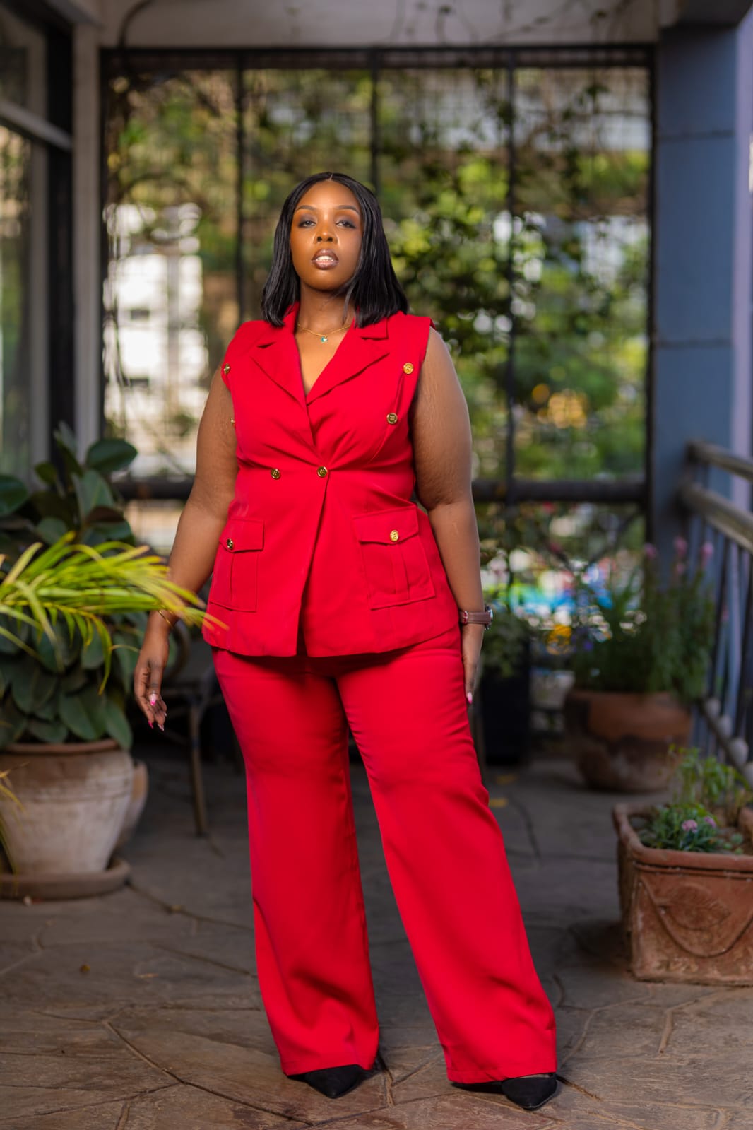 - Bottom: The suit includes matching high-waisted, wide-leg trousers that provide a flowing and polished silhouette.