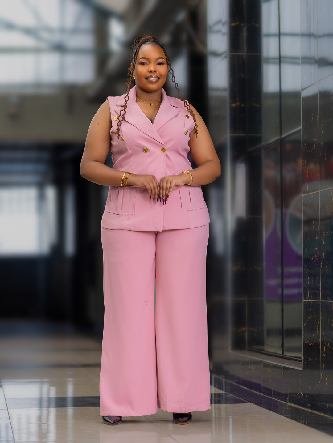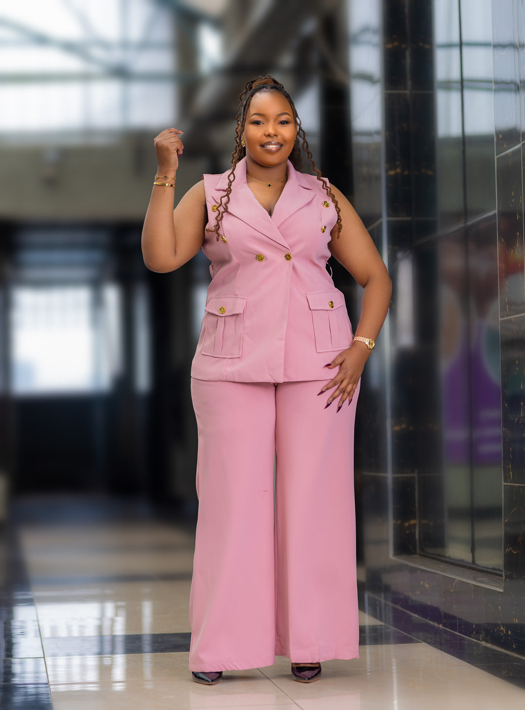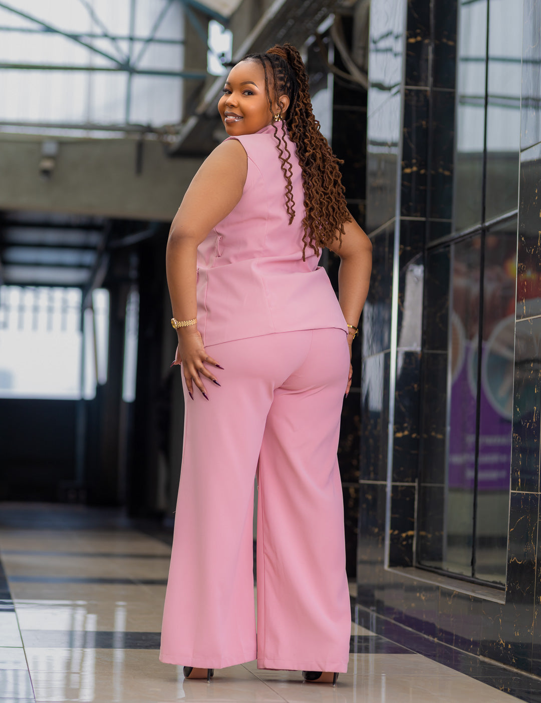 - Color: The ensemble is a solid shade of pink, which can be described as blush or light pink.