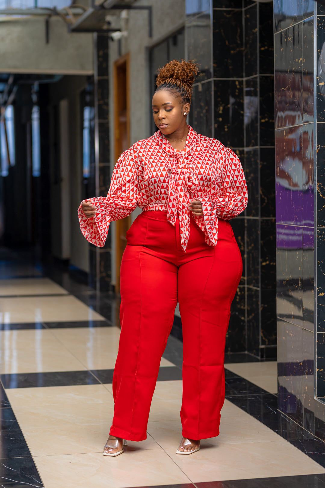 Make a statement with the NANA Blouse, where bold style meets timeless elegance. This striking long-sleeved piece showcases a vibrant red and white geometric print that commands attention. The signature bow tie-neck detail adds a touch of sophistication, while voluminous sleeves with ruffled cuffs create movement and dimension. Perfect for elevating your everyday look or standing out at special occasions, this blouse effortlessly transitions from office to evening. Embrace confidence in a design that celebrates individuality and refined taste.