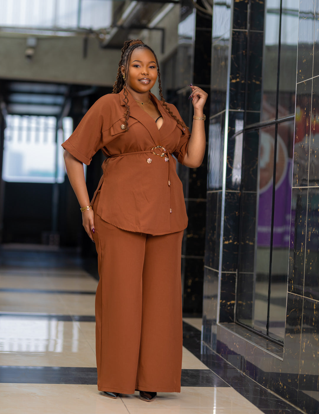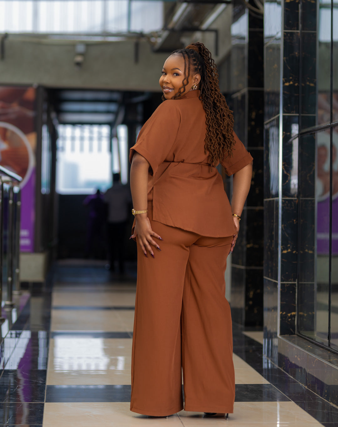 Elevate your wardrobe with the SANSA 2PCS SUIT, a sophisticated ensemble designed for the modern woman who commands attention. The crossbody top features elegant gold detail buttons and flattering elbow-length sleeves, while the detachable slim belt with a gold buckle adds versatile styling options. Pair it with the floor-length palazzo pants complete with functional pockets—the perfect blend of comfort and elegance. Whether you're heading to the office or a special occasion, this two-piece set delivers timeless style with contemporary flair.