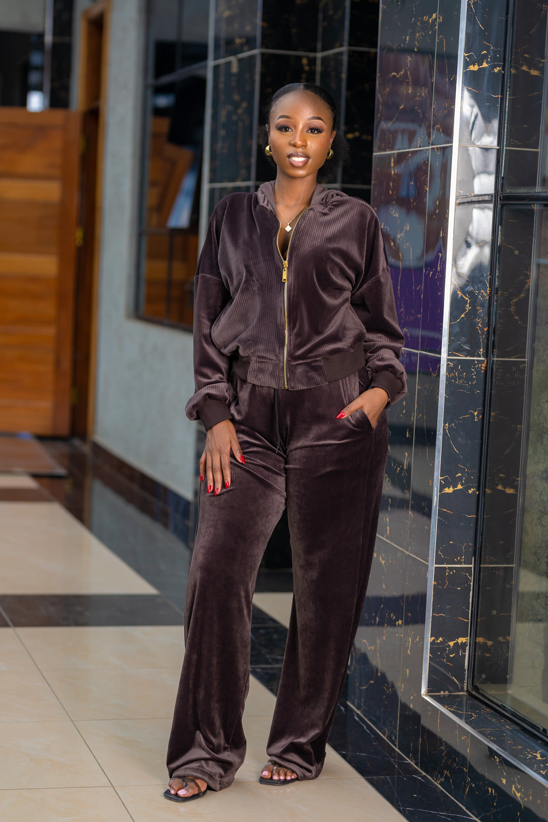 Elevate your loungewear collection with this luxurious velvet track suit, designed for those who refuse to compromise on comfort or style. Crafted from sumptuous velvet fabric, this two-piece set features a zip-up hoodie with a refined silhouette and wide-legged pants that drape effortlessly. The elastic hem on the hoodie and elastic waistband on the pants ensure a secure, flattering fit that moves with you. Perfect for relaxed days at home or casual outings, this track suit combines softness with contemporary design for an understated yet polished appearance.